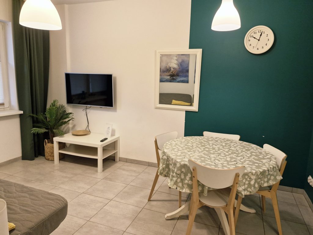 W dużym pokoju znajduje się rozkładana sofa dwuosobowa o wymiarach140x200, stół jadalniany i cztery krzesła.