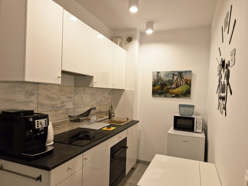 Kuchnia w pełni wyposażona: lodówka, płyta indukcyjna, zmywarka, mikrofala, czajnik elektryczny, automatyczny ekspres do kawy z zapasem kawy w ziarnach, naczynia, talerze i sztućce.