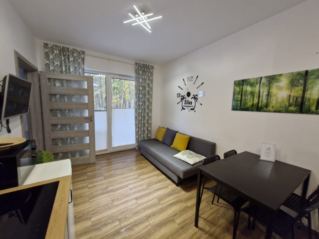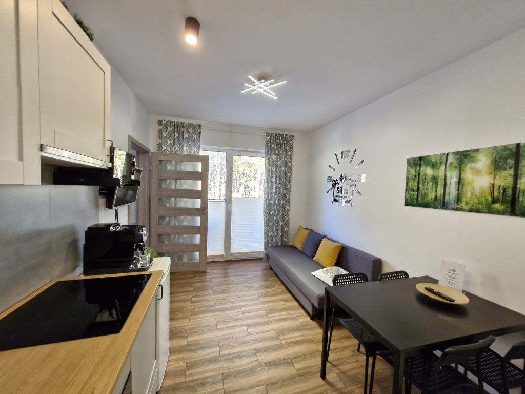 W pokóju z aneksem kuchennym znajduje się rozkładana sofa dwuosobowa oraz stół i 4 krzesła.