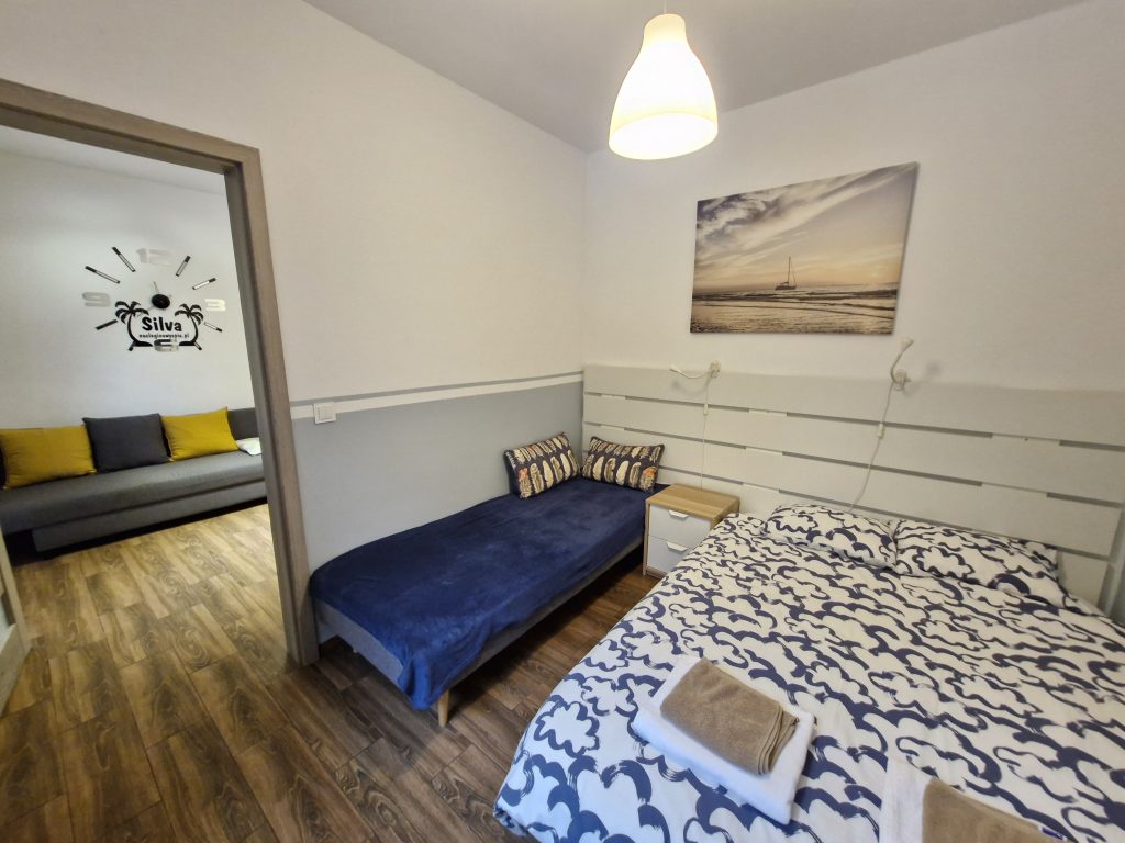 W sypialni znajduje się podwójne łóżko 140×200 oraz pojedyncze 80×200.